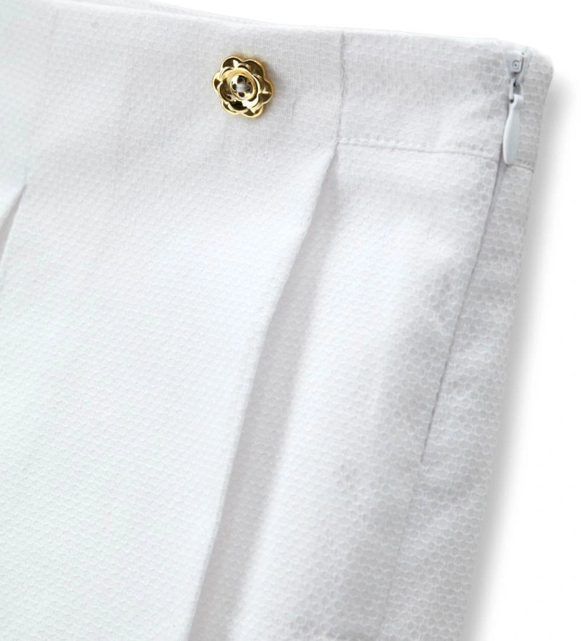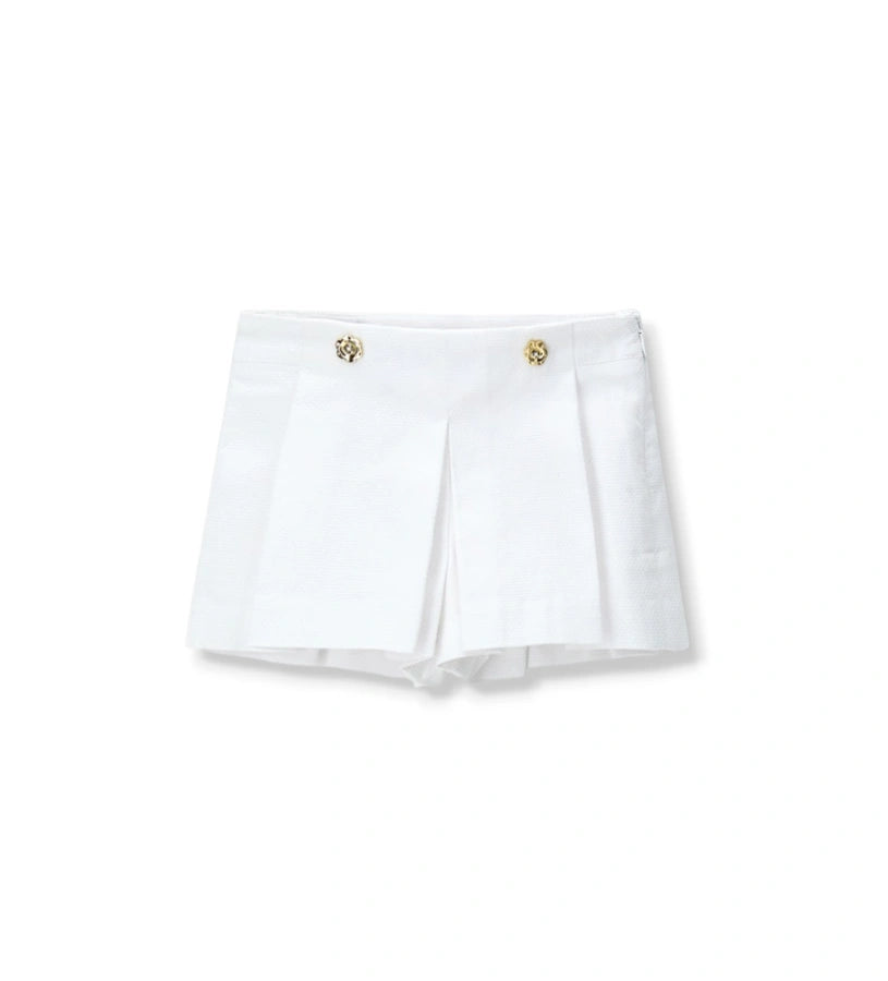 Η κλασική κομψότητα και η δροσερή αίσθηση ενώνονται σε αυτή την παιδική βερμούδα για κορίτσι. Κατασκευασμένη από 100% βαμβακερό ύφασμα με την ιδιαίτερη κυψελωτή ύφανση (nido d'ape) σε καθαρό λευκό χρώμα, η συγκεκριμένη βερμούδα προσφέρει ένα "refined look" που παραμένει διαχρονικό. Διαθέσιμη για ηλικίες από 6 μηνών έως 5 ετών, διαθέτει κομψές πιέτες στο μπροστινό μέρος και διακοσμητικά κουμπιά, χαρίζοντας μια "perfect" εμφάνιση για τις καλοκαιρινές εξορμήσεις ή τις πιο επίσημες στιγμές.