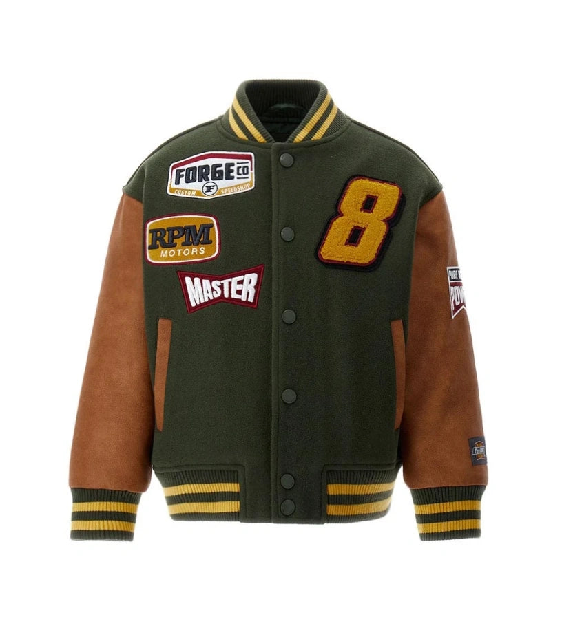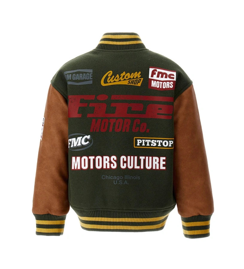 Μπουφάν bomber από ύφασμα με μανίκια από οικολογικό δέρμα σε αντίθεση, με γέμισμα και καπιτονέ εσωτερικά. Κεντημένα απλικέ στο μπροστινό μέρος, τύπωμα στην πλάτη και ριμπ τελειώματα από βαμμένο νήμα.