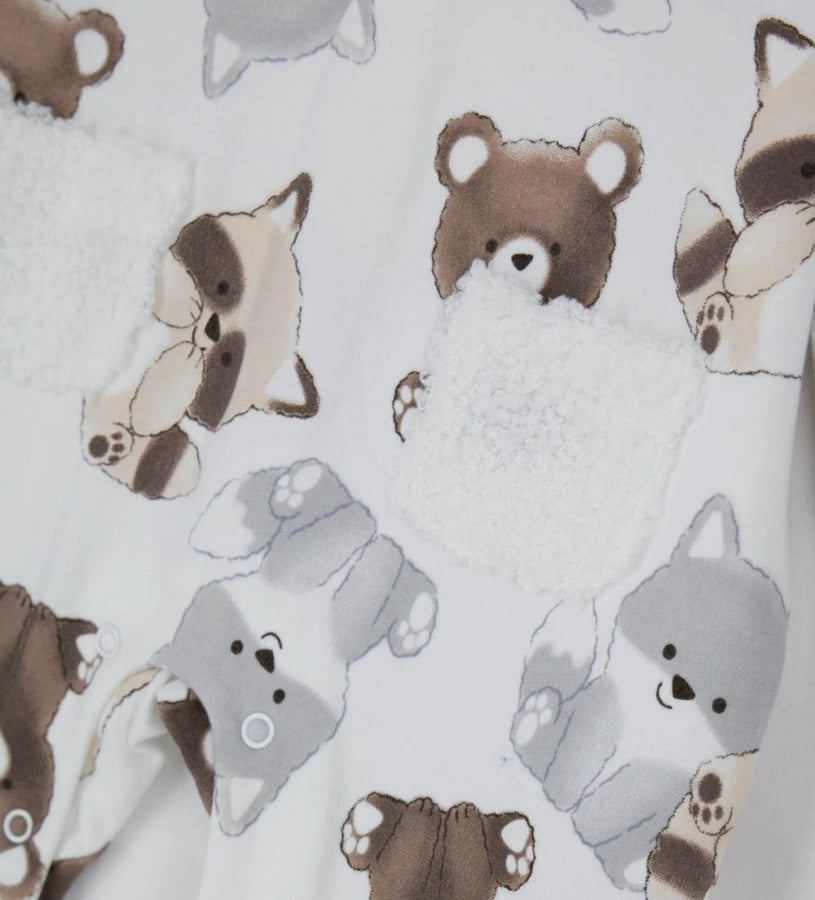 Φούτερ με μακρυμάνικα, στρογγυλή λαιμόκοψη, συνολικό (allover) τύπωμα, πλαϊνές τσέπες από ψεύτικη γούνα, άνοιγμα με κουμπί-σούστα και κέντημα στο μπροστινό μέρος.
