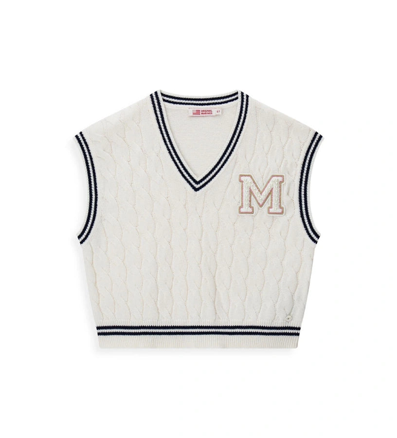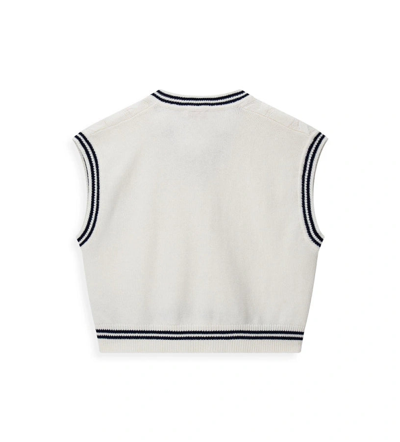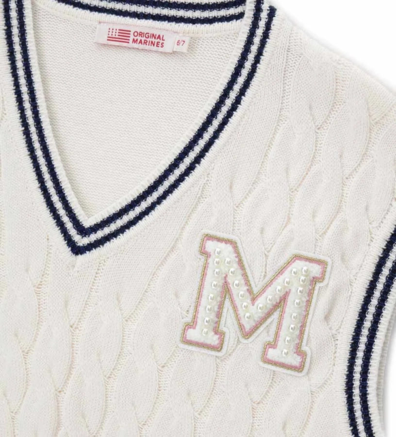 Πλεκτό γιλέκο με στρογγυλή λαιμόκοψη και ριμπ τελειώματα. Διακοσμημένο με ζακάρ λεπτομέρειες και μπροστινή εφαρμογή με χάντρες για μια κομψή και ξεχωριστή πινελιά.